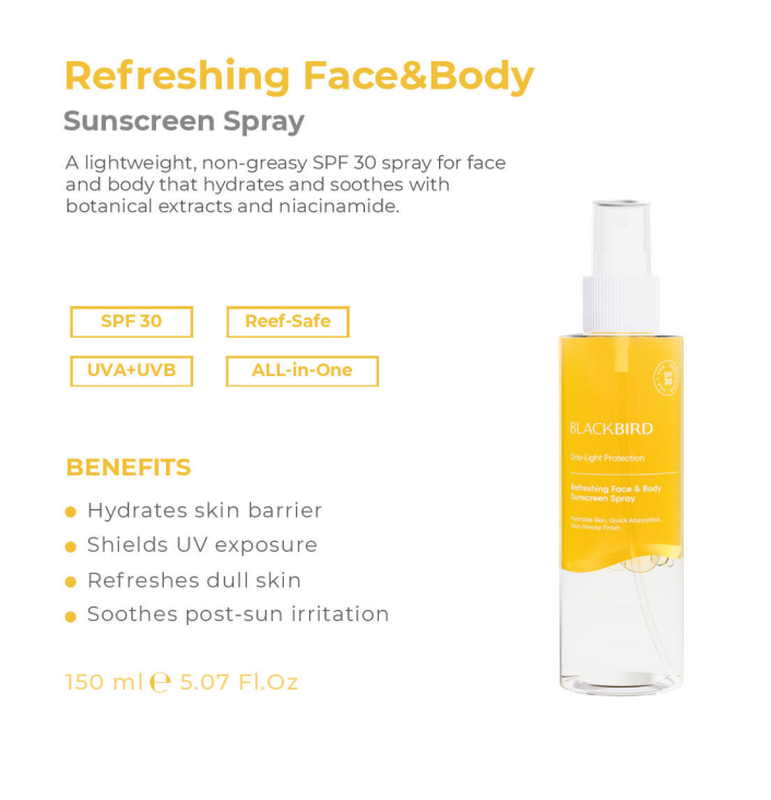 The Refreshing Face & Body Sunscreen Spray reflects Blackbird Skincare’s dedication to performance-driven formulation and advanced texture engineering. Every element — from the biphasic structure to the environmental safety — is designed with both consumer delight and manufacturer responsibility in mind.